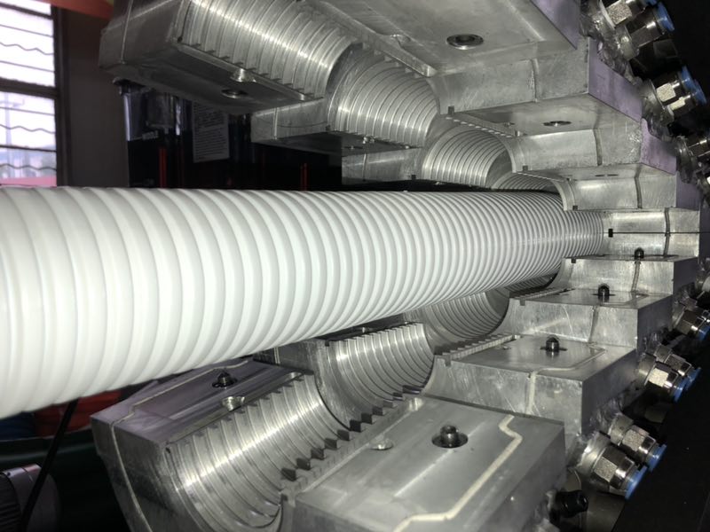 Application: corrugated pipe for air ventilation system is produced by two different PE material. Double wall corrugated pipe, and