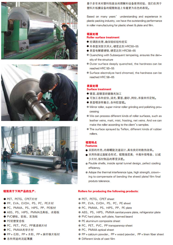 不但致力于塑料板材、片材用壓延輥筒的 設(shè)計制造,同時也為塑料薄膜領(lǐng)域提供高品質(zhì)的輥筒。 引進國外先進的制輥技術(shù),我們?yōu)榱餮幽ぴO(shè)備、拉伸膜設(shè)備提供高品質(zhì)輥 筒。如激冷輥、拉伸輥、預(yù)熱輥、牽引輥、電暈輥、橡膠輥、TEFLON 輥等。 生產(chǎn)塑料薄膜用輥筒的極高轉(zhuǎn)速,使輥筒的動平衡精度顯得尤為重要。專 用的大型動平衡校驗設(shè)備和多種平衡方法使這些要求得到有效的保證。 薄膜制品成型對輥面溫度誤差的要求很嚴格。帶內(nèi)螺旋循環(huán)流道的輥筒 是一項高技術(shù)含量的產(chǎn)品,具有極強的熱交換能力和輥筒作業(yè)表面容許 的最小溫度波動。